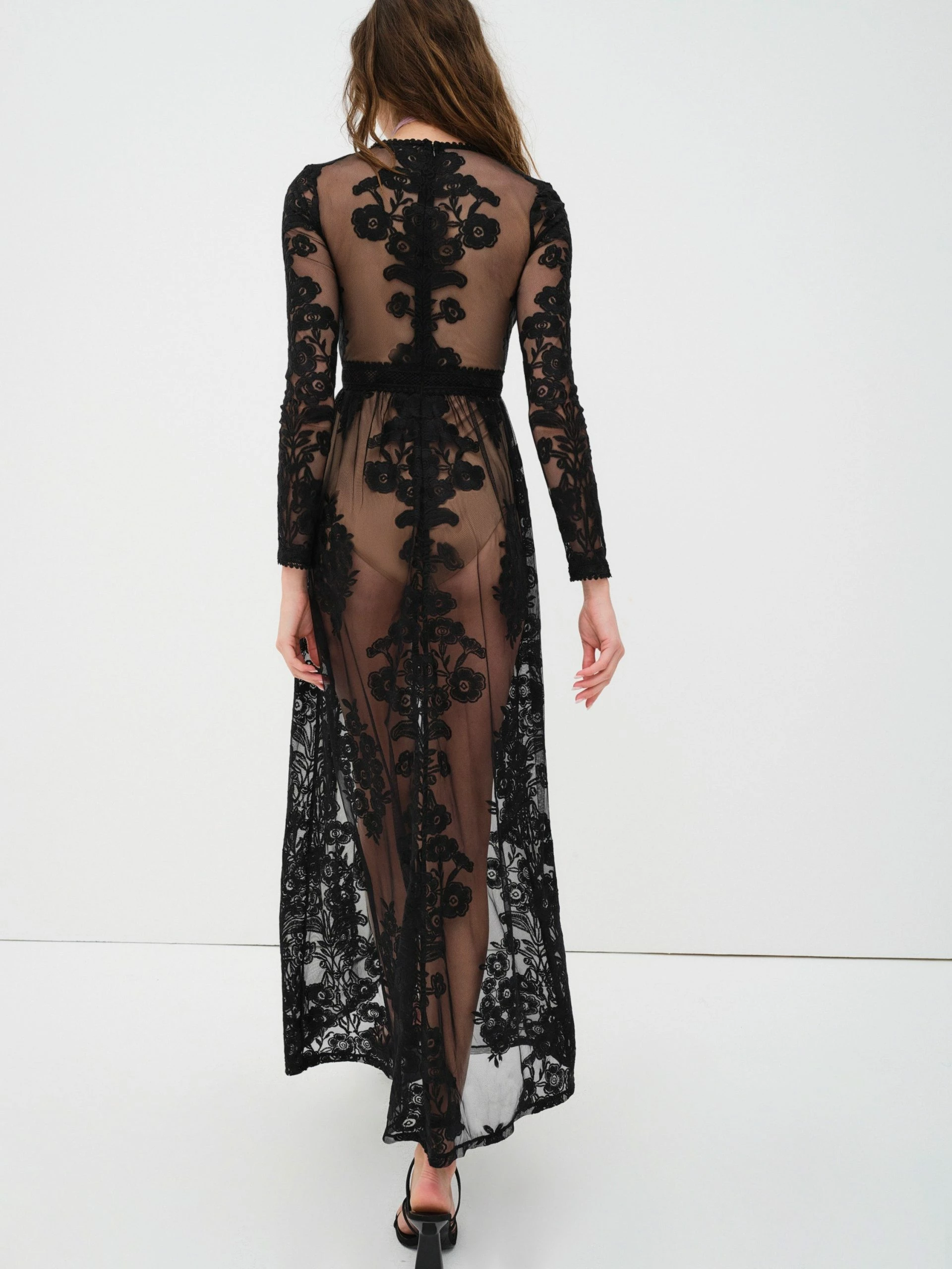 Dramatic sheer net maxi with allover floral embroidered detailing in an elegant silhouette.