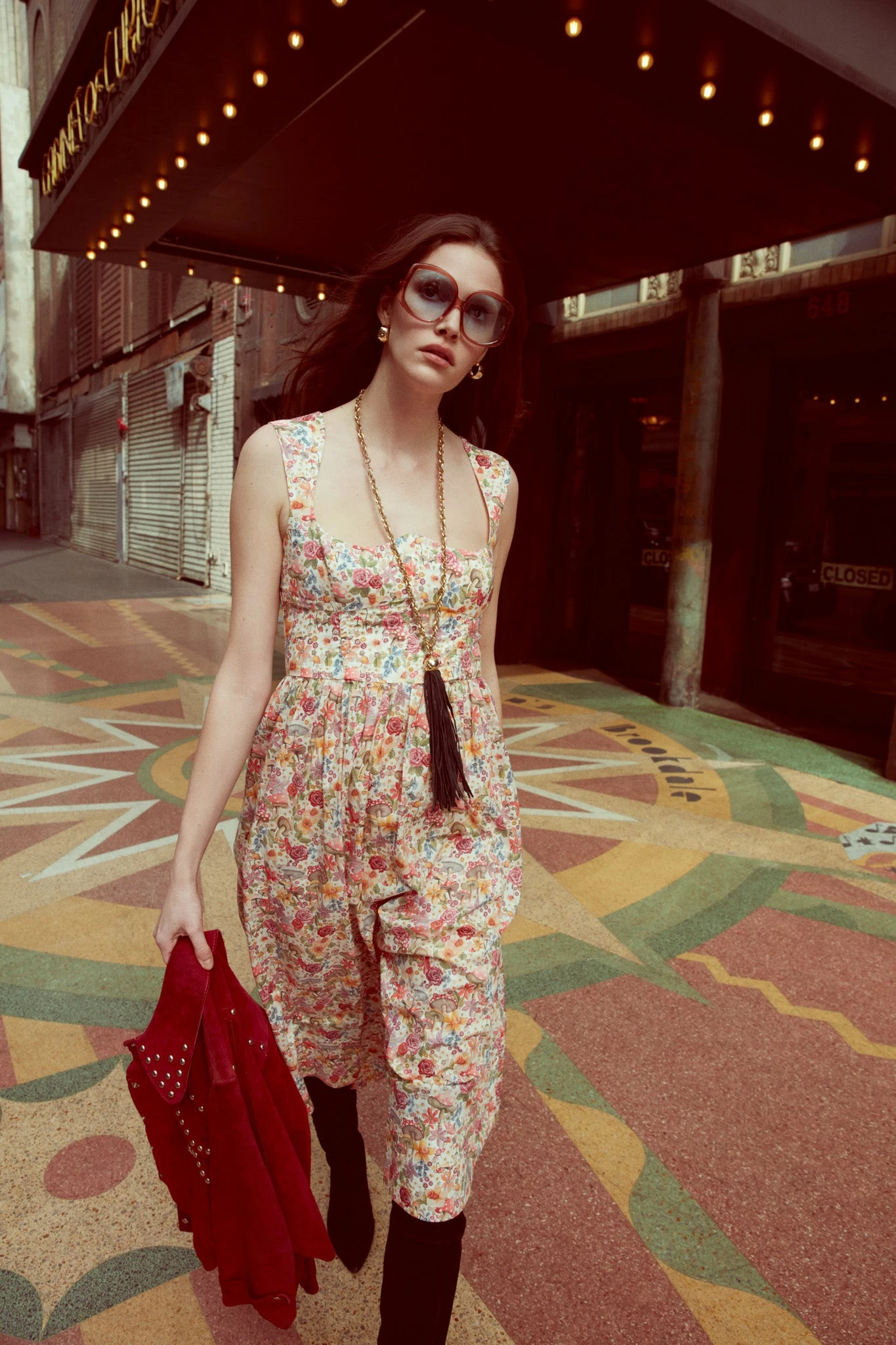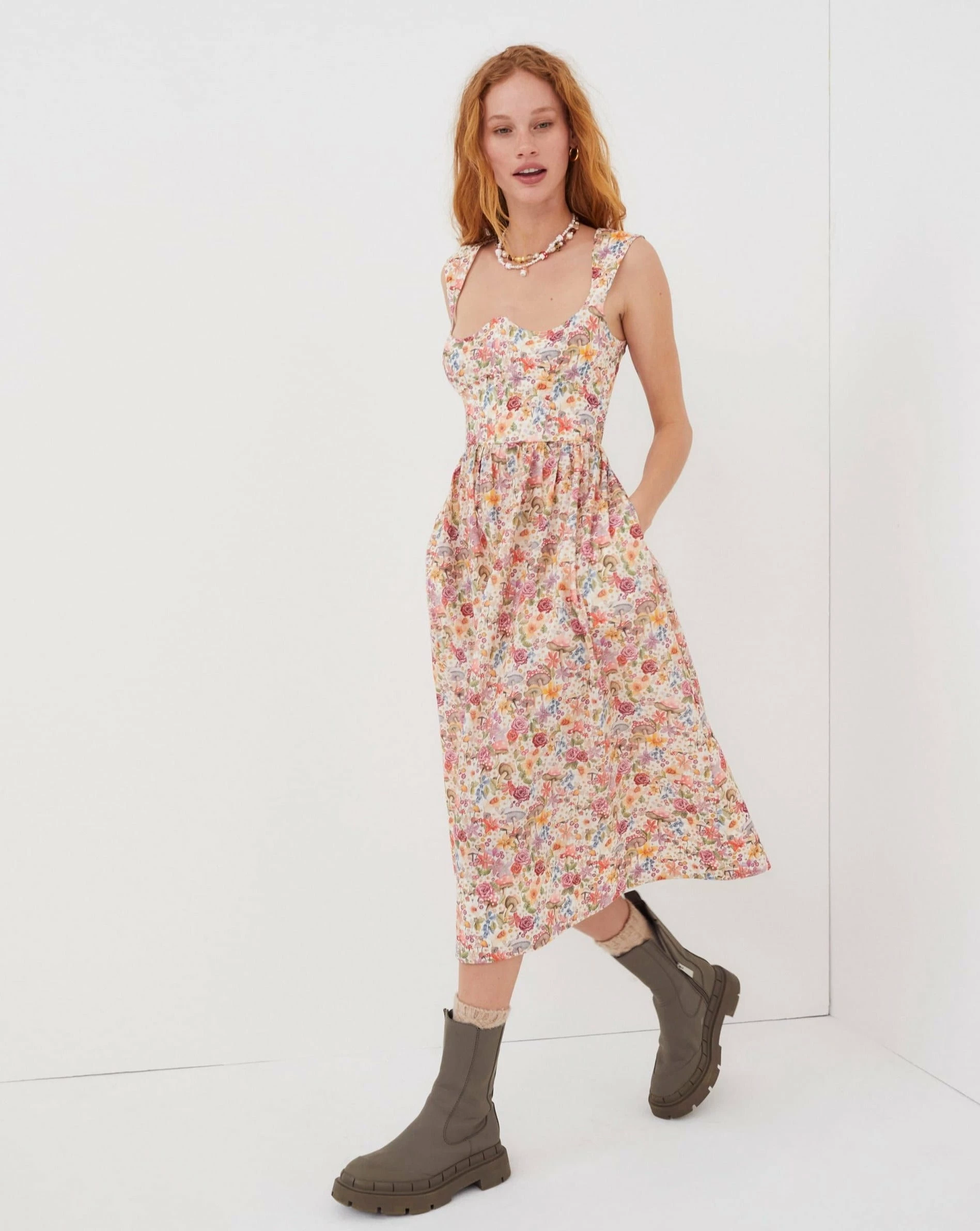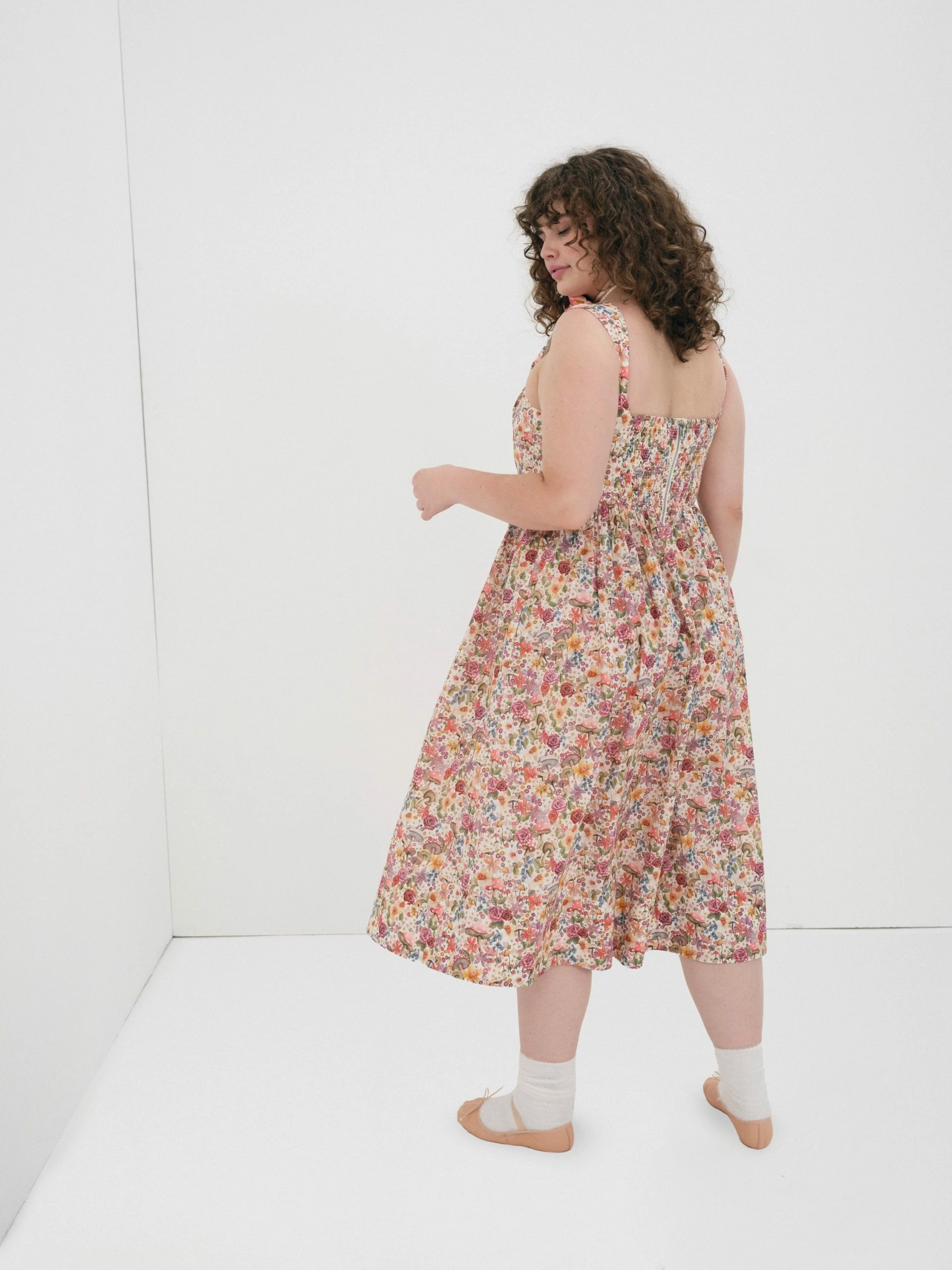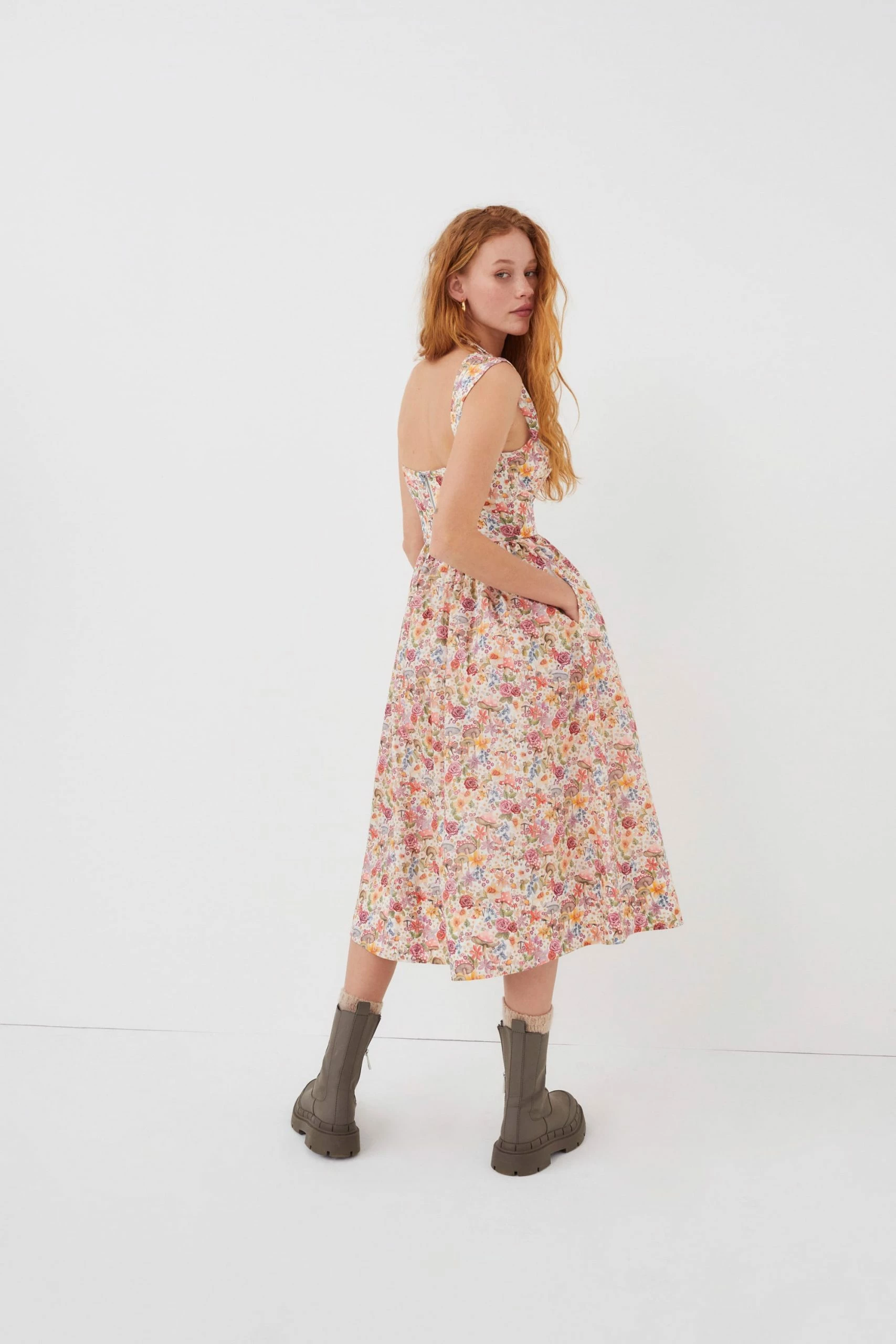 Wonderland midi dress with curved neckline and angled straps. Gathered skirt with pockets.