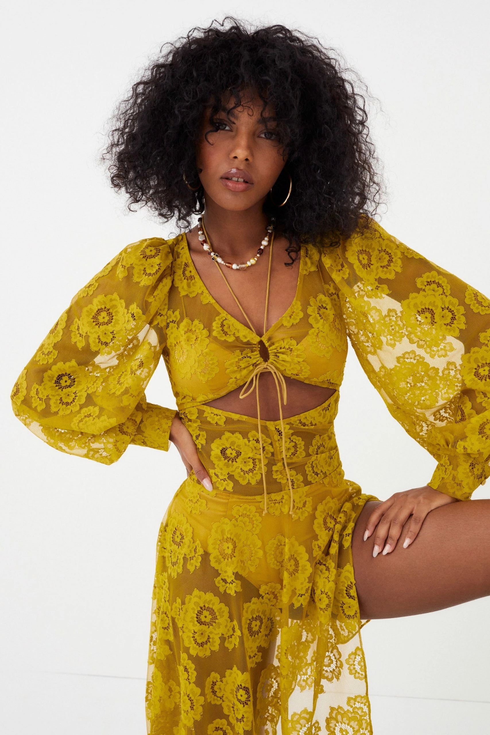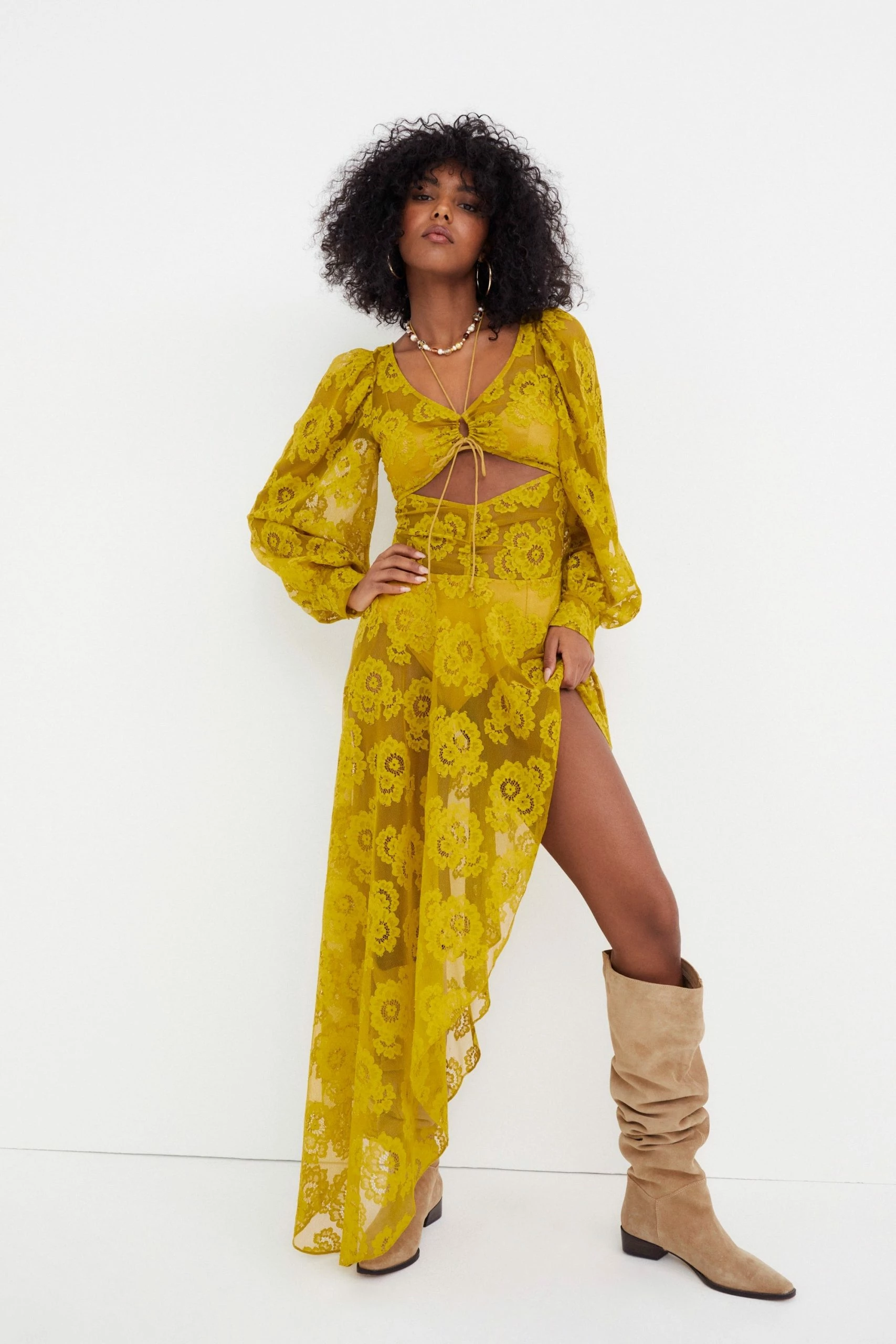 Bouquet lace midi dress with drawstring keyhole at bodice, gathered asymmetrical skirt, long sleeves with functional cuff and open back detail with tie across shoulders.