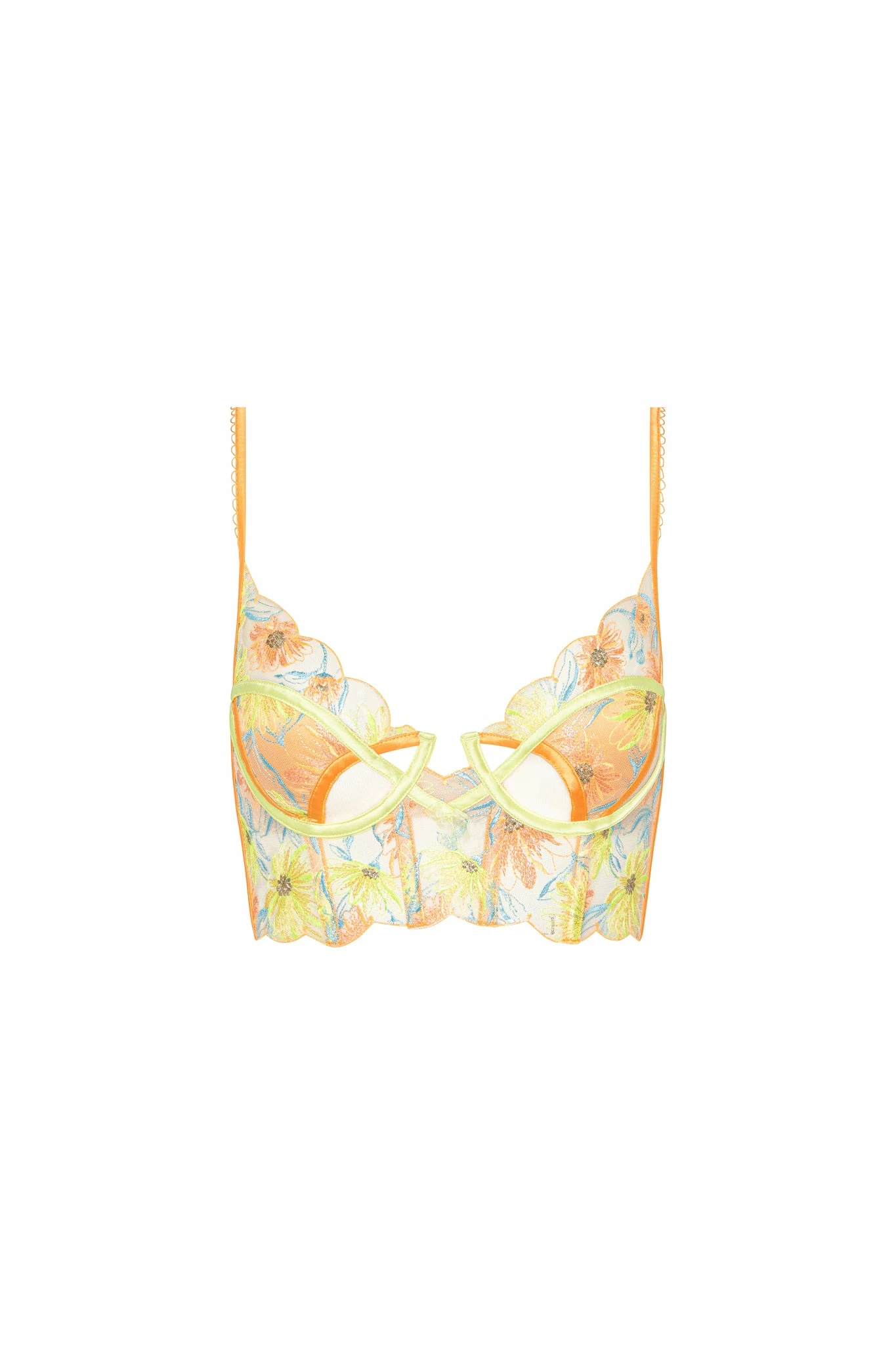 Channel your inner impressionist in an exquisite corset featuring floral embroidery that evokes lush water lilies in soft neons. Completed with notched underwire cups, cutouts, and a strappy cage back. Pair with the matching panty for all-out romance.