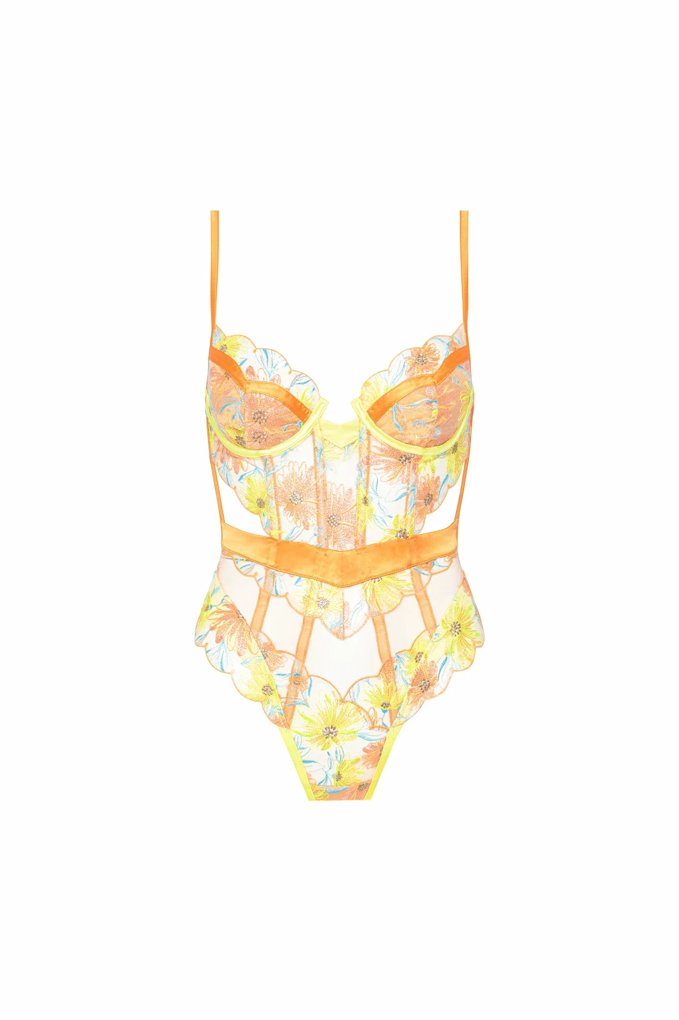 Channel your inner impressionist in an exquisite bodysuit featuring floral embroidery that evokes lush water lilies in soft neons. The back is as stunning as the front, with strappy cutouts, a pretty satin ribbon tie, and barely-there thong.