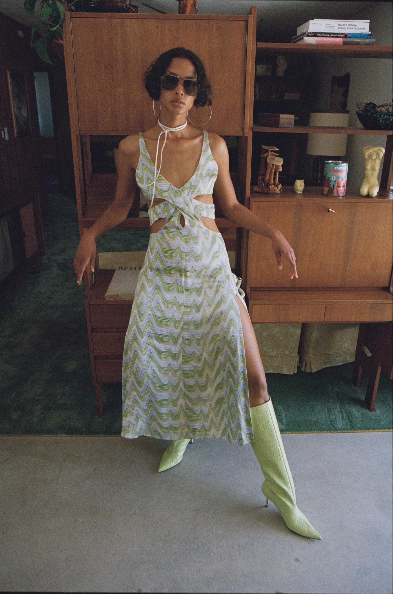 Slinky print midi dress with crossover front neckline and keyholes along side waist. Flowy skirt and twisted back straps.