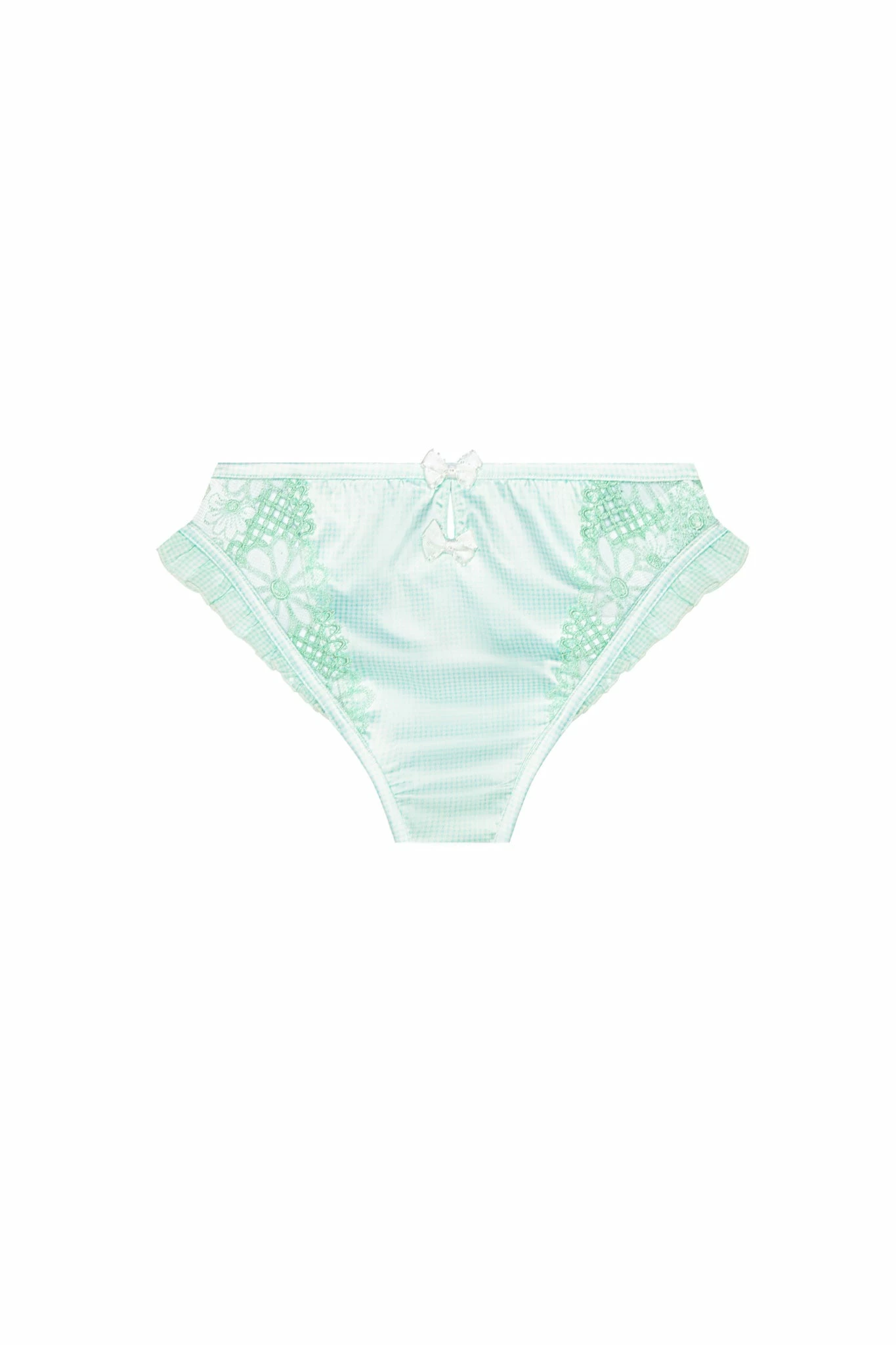 The prettiest piece to add to your top drawer—a cheeky, high-waist brief combining daisy embroidered lace and fluttery ruffles with stretch satin in sweet gingham checks. Keyhole cutouts, decorative bows, and a covered button in back make it extra special.